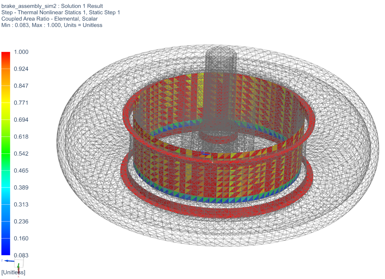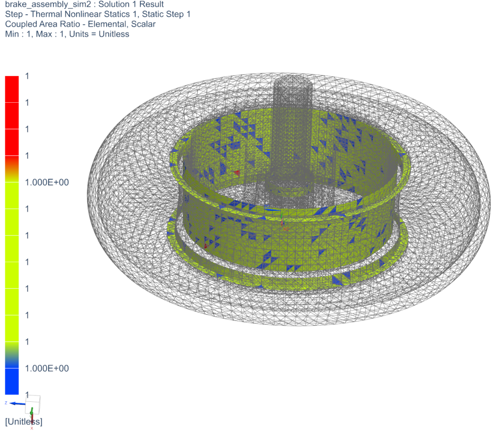 In the first image, note that the ratio in the brake pad to wheel connection is significantly less than 1 in some areas, indicating that the thermal coupling is incorrectly defined. In the second image, the coupled ratio is equal to 1, signifying that the thermal connections are correctly established.