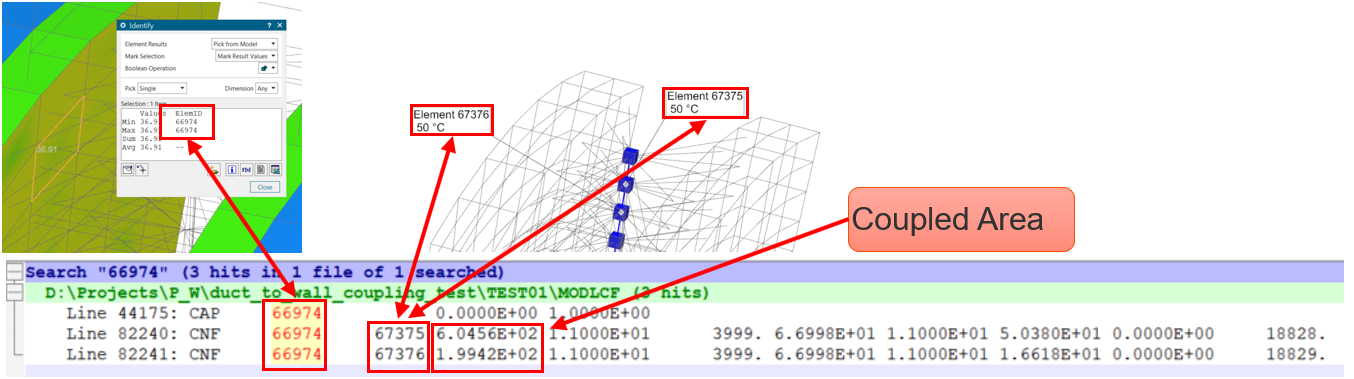 From the MODLCF file below, we can see the surface element 66974 is connected to element 67375 and 67376.