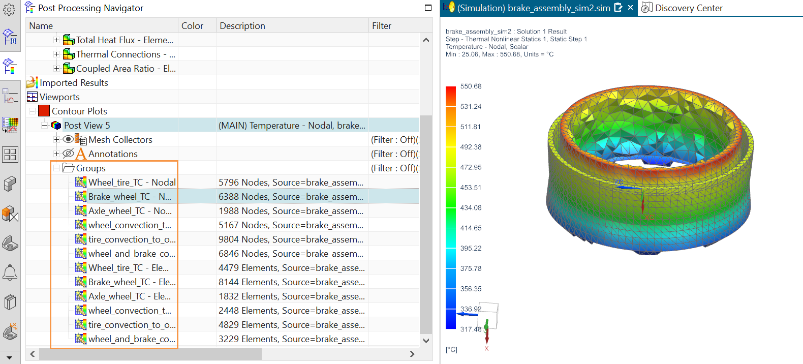 In the Post Processing Navigator, these results are stored in the Groups node under the post view node.