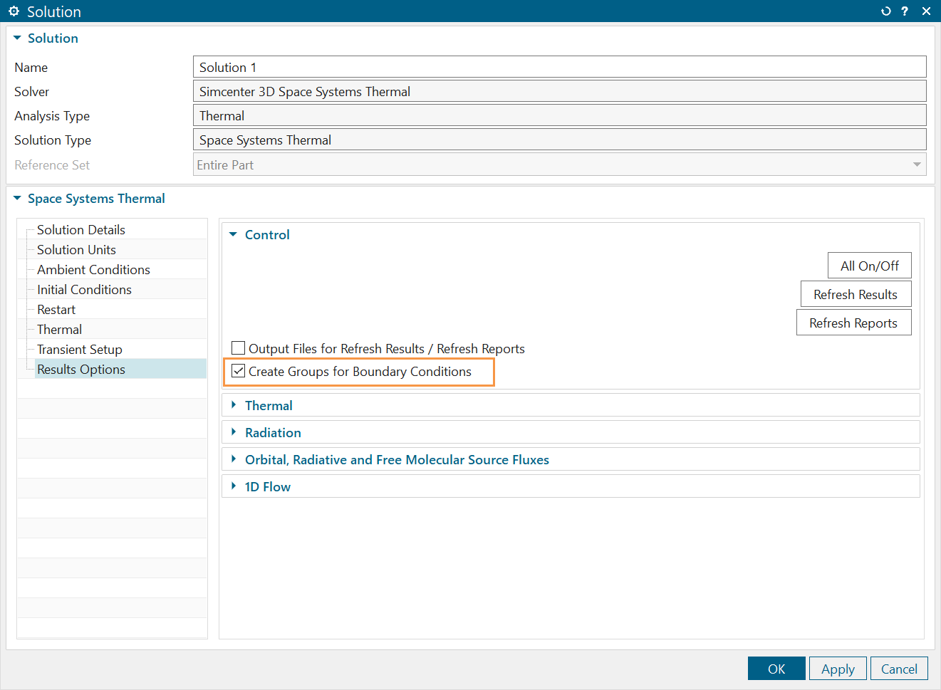 In the Simcenter 3D Thermal/Flow, Simcenter 3D Space Systems Thermal, and Simcenter 3D Electronic Systems Control environments, right-click the solution and select Edit. On the Results Options page, select the Create Groups for Boundary Conditions check box.