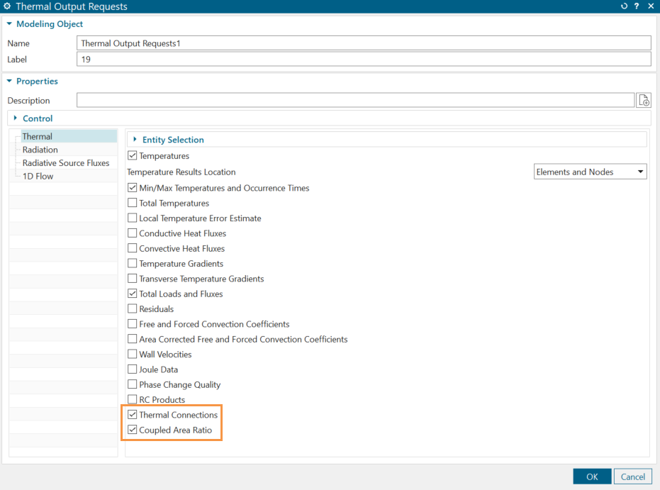 In Simcenter 3D Thermal/Flow, Simcenter 3D Space Systems Thermal, Simcenter 3D Electronic Systems Cooling, right-click the solution and select Edit. On the Results Options page, under the Thermal tab, select the Thermal Connections and Coupled Area Ratio check boxes.