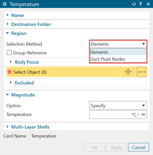 When you use the Convection Coupling type of the Thermal Coupling - Convection simulation object, the thermal solver computes convective heat exchange between fluid duct elements and the convective region on the wall. If you define the duct temperature only on the duct nodes by selecting Duct Fluid Nodes from the Selection Method list, temperature elemental results may fluctuate since the temperature is not imposed on elements, but temperature nodal results will match the temperature constraint. However, if you use the Duct Node Convection Coupling type, the temperature results will be consistent across both nodes and elements.
