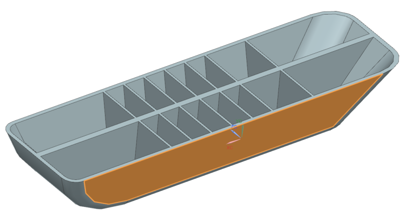 Midsurfaces are defined in the idealized part. You will use thickness to select face pairs to define the midsurface. In this part, the outer walls are about 2.5 mm thick, the lateral ribs are about 1.5 mm thick, and the central rib is about 4 mm thick.