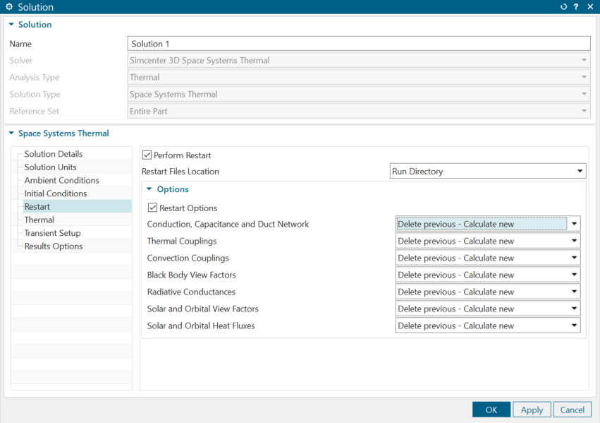 -1 -1 RESTART ON -1 -1 -1 -1 -1 -1 $ $ ----------------------------- $ Solution Attributes - Restart $ ----------------------------- $ PARAM RESTARTDIR D:\pathToFiles\solutionDirectory\\ PARAM RESTART COND_CAP_FLUID DELETE CALC PARAM RESTART THERMAL_COUPLINGS DELETE CALC PARAM RESTART CONVECTION_COUPLINGS DELETE CALC PARAM RESTART BLACK_BODY_VIEW_FACTORS REUSE NOCALC PARAM RESTART RADIATIVE_CONDUCTANCES DELETE CALC PARAM RESTART ORBITAL_VIEW_FACTORS DELETE CALC PARAM RESTART HEAT_FLUX_VIEW_FACTORS DELETE CALC PARAM RESTART ORBIT_HEAT_FLUXES DELETE CALC $ -1 -1 - Save the thermal input file and add to the run directory.