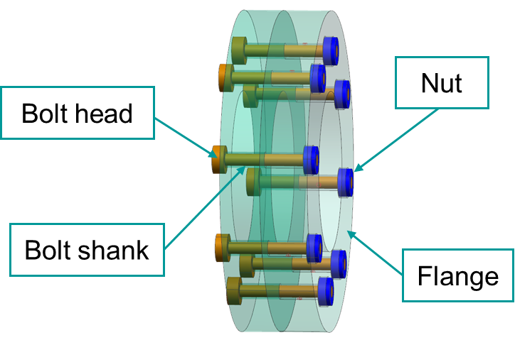 The following example shows the 3D model of two discs (flanges) fastened together by 8 bolts and nuts.