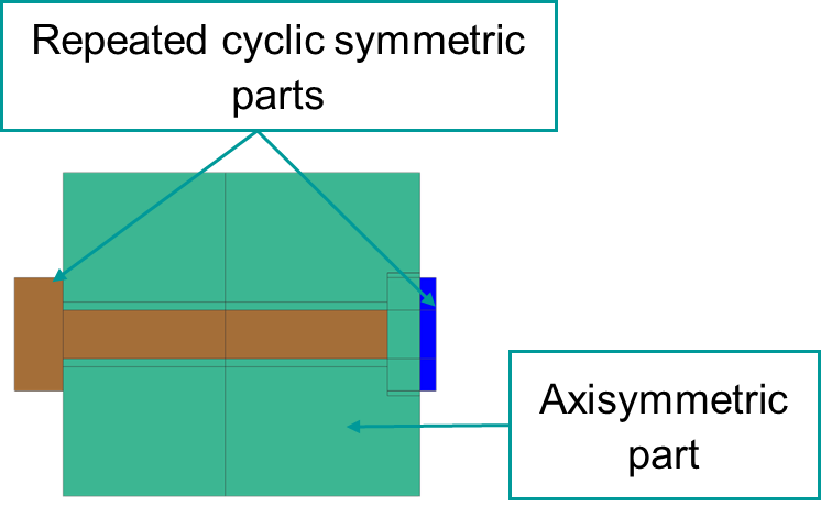 - Repeated cyclic symmetric parts, such as nuts and bolts, around the axis of rotation that are meshed with plane stress elements (presented in brown in the image below). Plane stress elements have associated thickness and number of incrementsthat must be defined.
