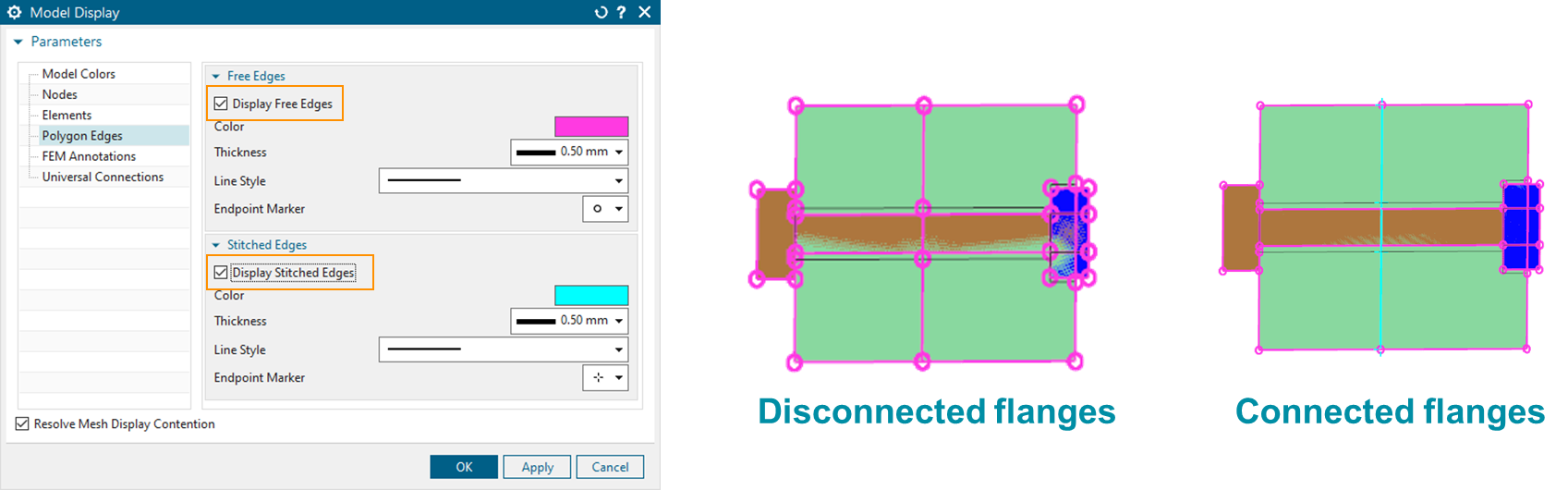 After dividing the faces, inspect and stitch free edges to connect geometrically disconnected solid bodies to model thermal conduction correctly. In the following example, there are two flanges connected by stitching free edges.