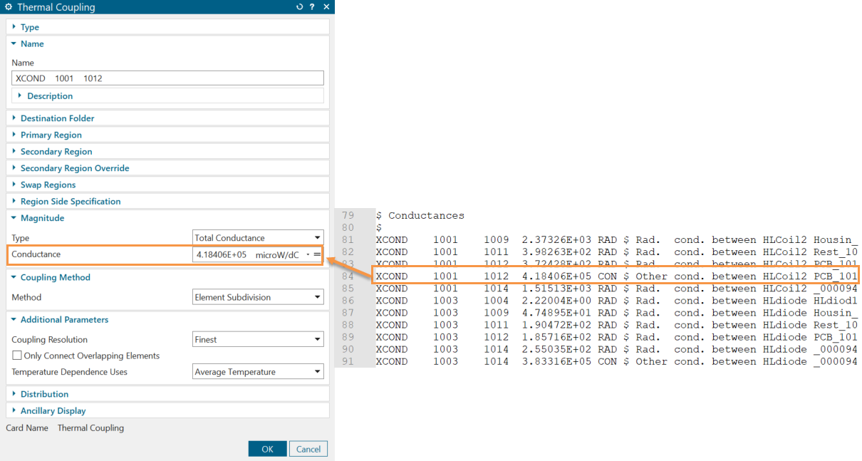 couplings, as specified in the INPF.reduced file.The following example demonstrates the conductive conductance between groups 1001 and 1012, sourced from the INPF.reduced file and applied in the thermal coupling.