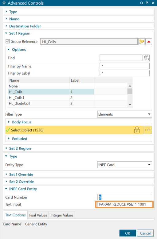 - In Text Input, enter PARAM REDUCE #SET1 ID, where