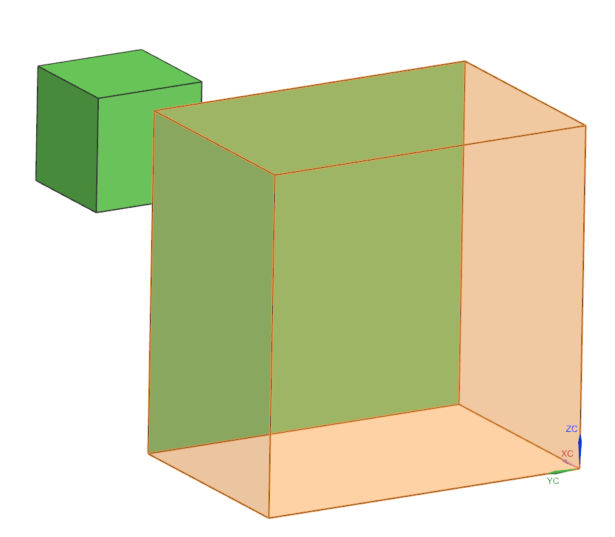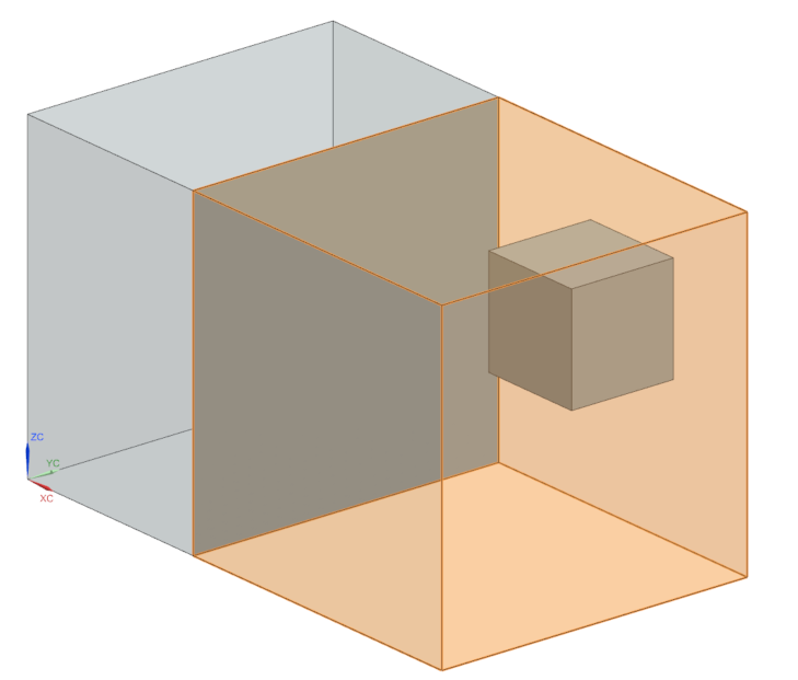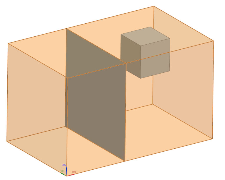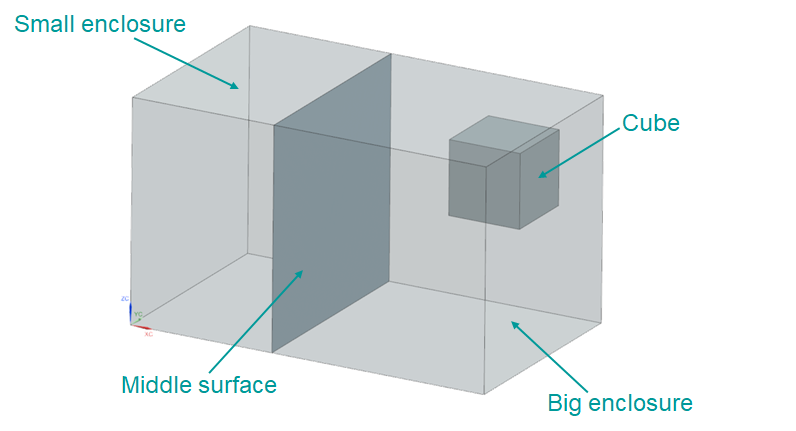 The model contains two enclosures, middle surface, and a cube inside the big enclosure.