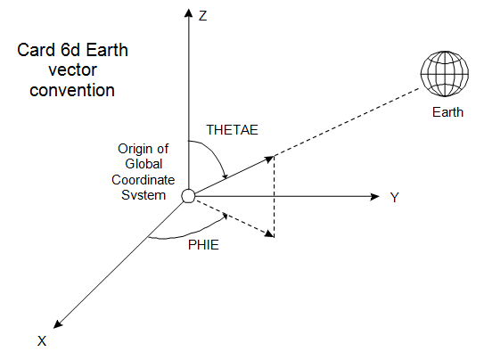 The Earth Card defines the position and albedo of the Earth at a particular TIME. It is used for albedo factor, Earth view factor, and solar eclipse calculations. These are performed only for those elements that appear on Solar View Factor Request Cards 6b with the same TIME parameters as on the Earth Card. An Earth Card without a corresponding Solar View Factor Request Card will be ignored.