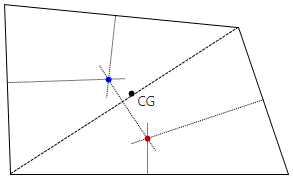 | Quadrilateral shell—irregular shape | Center of the sub-element closest to the CG (blue point)