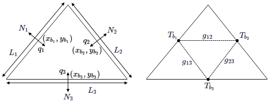 The unit normal vectors, Ni,on triangle edges, Lj, are defined based on the coordinates unit vectors i and j: