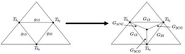 The conductance matrix between boundary elements of the triangle has three conductances, while the matrix between the CG and the boundary elements has six conductances. Despite the difference between the two matrices, they are equivalent. When a triangle has a linear temperature gradient, the temperature at its CG is equal to the average temperature of the midpoints of the side edges, which gives the following equations to compute the additional conductances between the CG and the boundary elements: