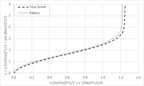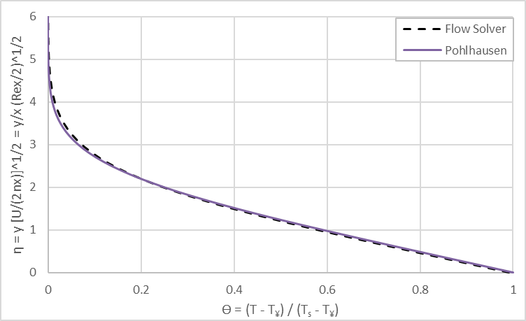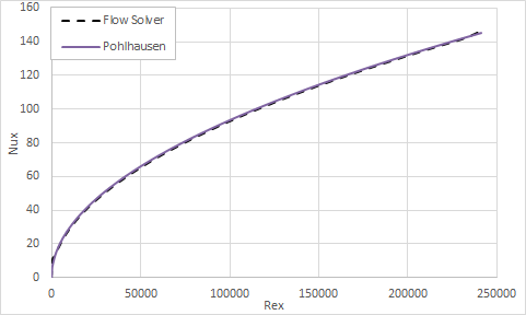 The theory of Blasius and Pohlhausen [8] is used as a basis of comparison for the solver results. In particular, we get for the friction coefficient and the Nusselt number: