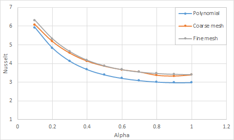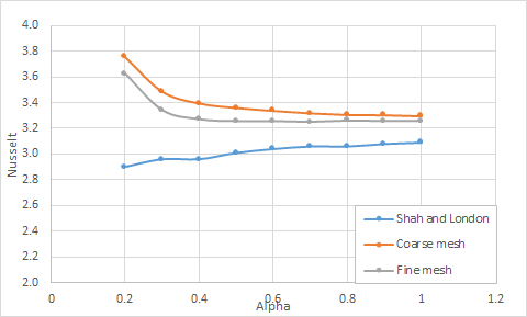 The following table and figure present the comparison of average Nusselt numbers predicted by the solver with the theoretical data for constant temperature duct walls.