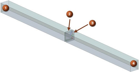 - Flow Boundary Condition: Opening on the outlet end (4) of the channel with the pressure difference between the two openings of 50 Pa
