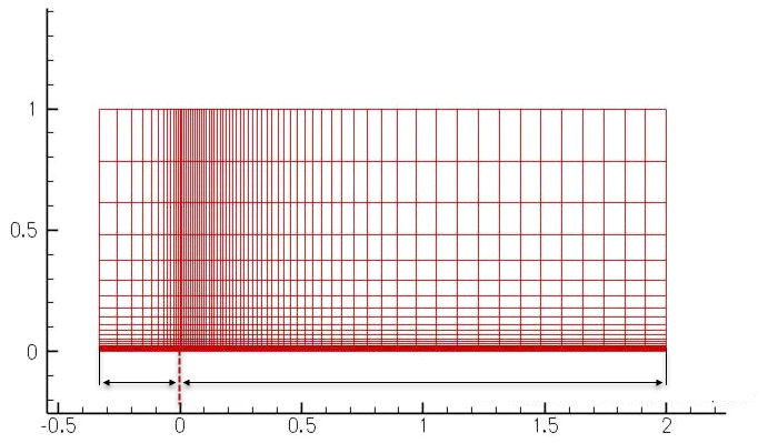 The mesh used in this validation case is a series of five 3D grids, of the same family, ranging from the finest to coarsest grid. This grid is created in the PLOT3D format defined by the NASA Langley Research Center [46]. After the grid is imported, the model includes only a single layer of 3D hexahedral elements. To obtain results that are similar to 2D results, the imported mesh is split into two element layers along Y direction, as shown in the following figure.
