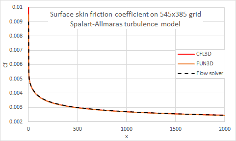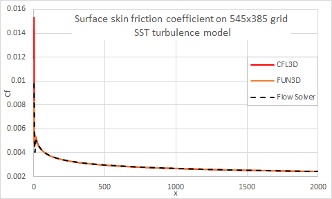 The following figures compare the flow solver results with the NASA CFD results for the surface skin friction coefficient on the finest 545x385 grid, over the entire plate for SST and Spalart-Allmaras turbulence models.