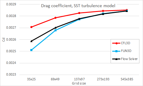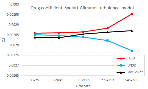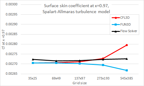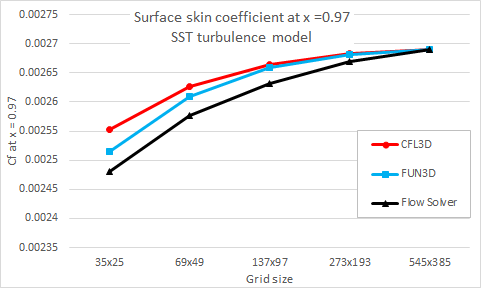 The following figures compare the flow solver results with the NASA CFD results for the wall skin friction at x = 0.97008 and the drag coefficient with a grid size for both SST and Spalart- Allmaras turbulence models.